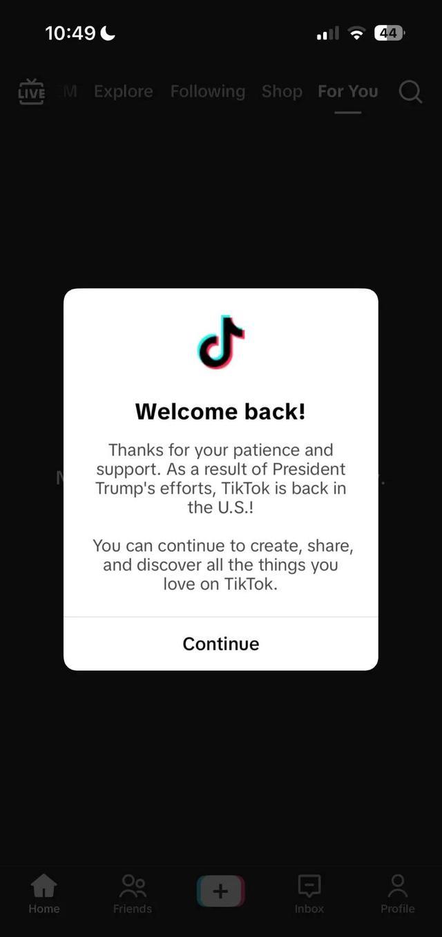 美国时间1月19日早上,许多TikTok的美国用户发现,前一晚下线的TikTok又可以重新使用,在打开TikTok应用后,系统自动弹窗通知称:“感谢您的耐心和支持,依靠总统特朗普的努力,TikTok在美国重新回来了,你可以在TikTok上继续创作、分享和寻找你所爱的所有一切。”
