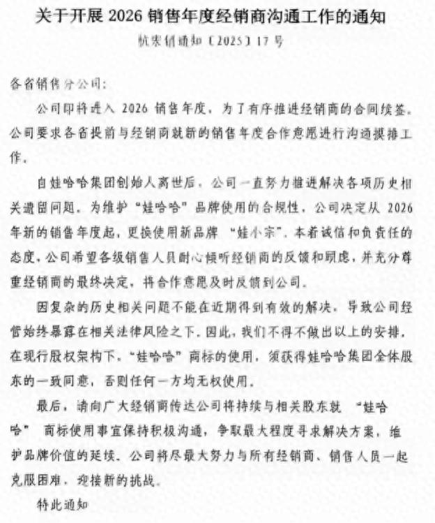 近日,网上流传出了一份娃哈哈企业的内部通知,上面显示娃哈哈或将在2026年全面使用新品牌“娃小宗”。