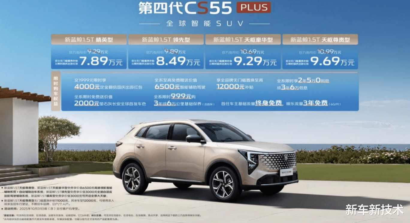 第四代CS55PLUS此次推出的四款车型——新蓝鲸1.5T精英型、领先型、天枢豪华型与天枢尊贵型,在叠加无门槛置换补贴及限时国庆出游红包后,售价区间为7.89万元至9.69万元。除了极具竞争力的价格,长安汽车还为消费者准备了多重权益:交1999元定金可享4000元国庆出游红包、全品牌无门槛置换补贴至高12000元、全系至高免费赠送价值6500元智能辅助驾驶系统、限时金融免息/低息政策、免费专属车色、超值保养套餐以及流量礼遇等,诚意十足。