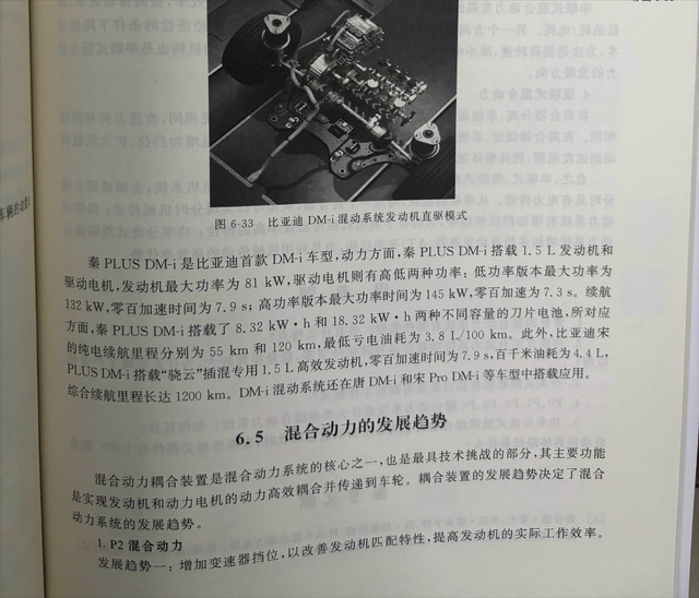 值得一提的是,在2025版教材中,比亚迪DM-i系统不仅出现在封面,更作为混动技术演进的典型模板,在多个章节中被重点剖析。教材详细展示了其以“插混专用高效发动机、EHS电混系统、专用功率型刀片电池”为核心的动力架构,从构型原理到控制策略,成为学生理解混动技术的“活教材”。这种从封面到内容的深度融入,标志着比亚迪DM技术已从单一的行业实践案例,升华为系统化的教学知识体系。