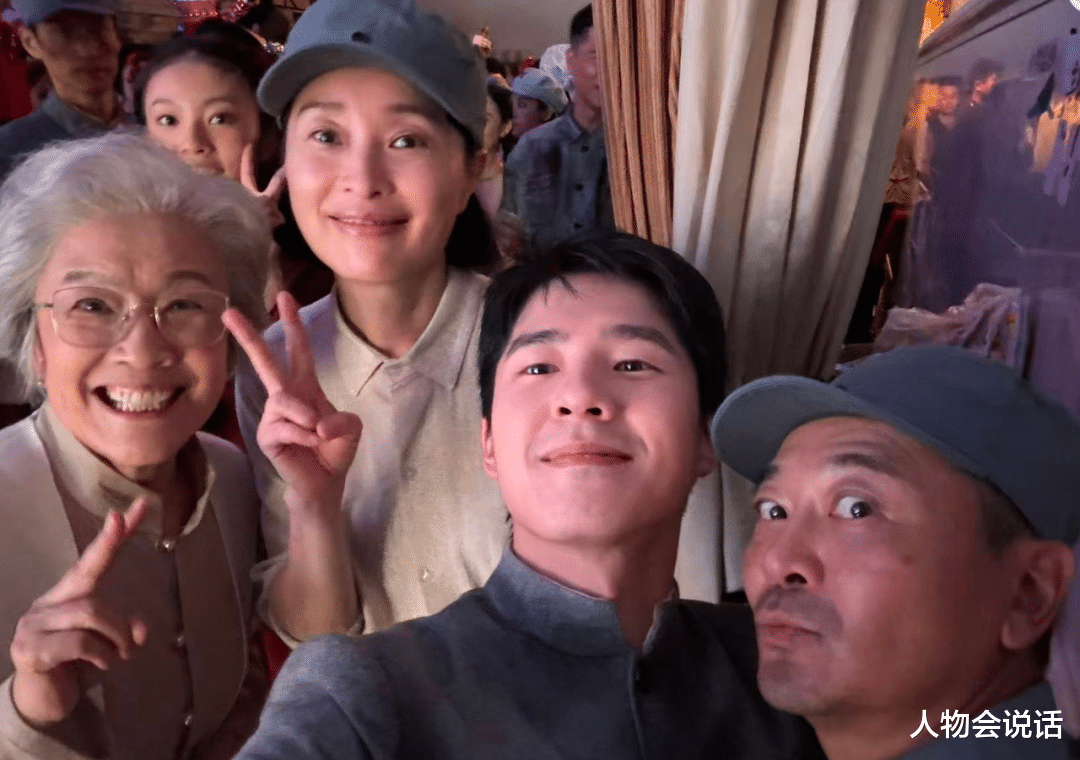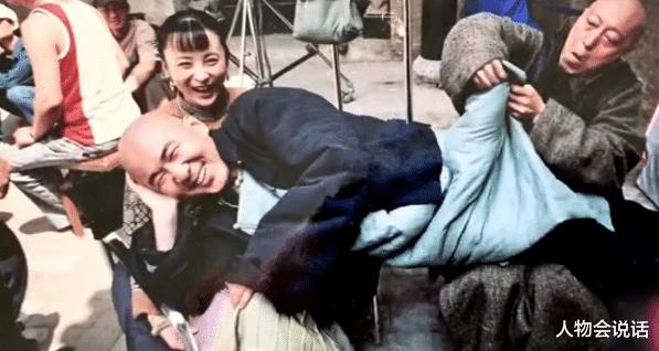 蒋勤勤倪大红拍杀青照,人俩坐得好好的,陈建斌非要厚脸皮躺蒋勤勤腿上;