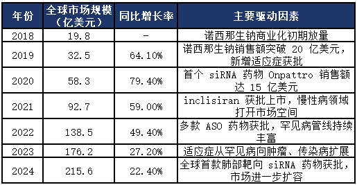 全球小核酸药物市场呈现“爆发式增长”态势,从2018年的19.8亿美元快速增长至2024年的215.6亿美元,年复合增长率(CAGR)达51.2%,增速远超传统制药行业。增长动力主要来自于已上市重磅药物的销售额提升、新适应症拓展及新获批药物的市场导入。