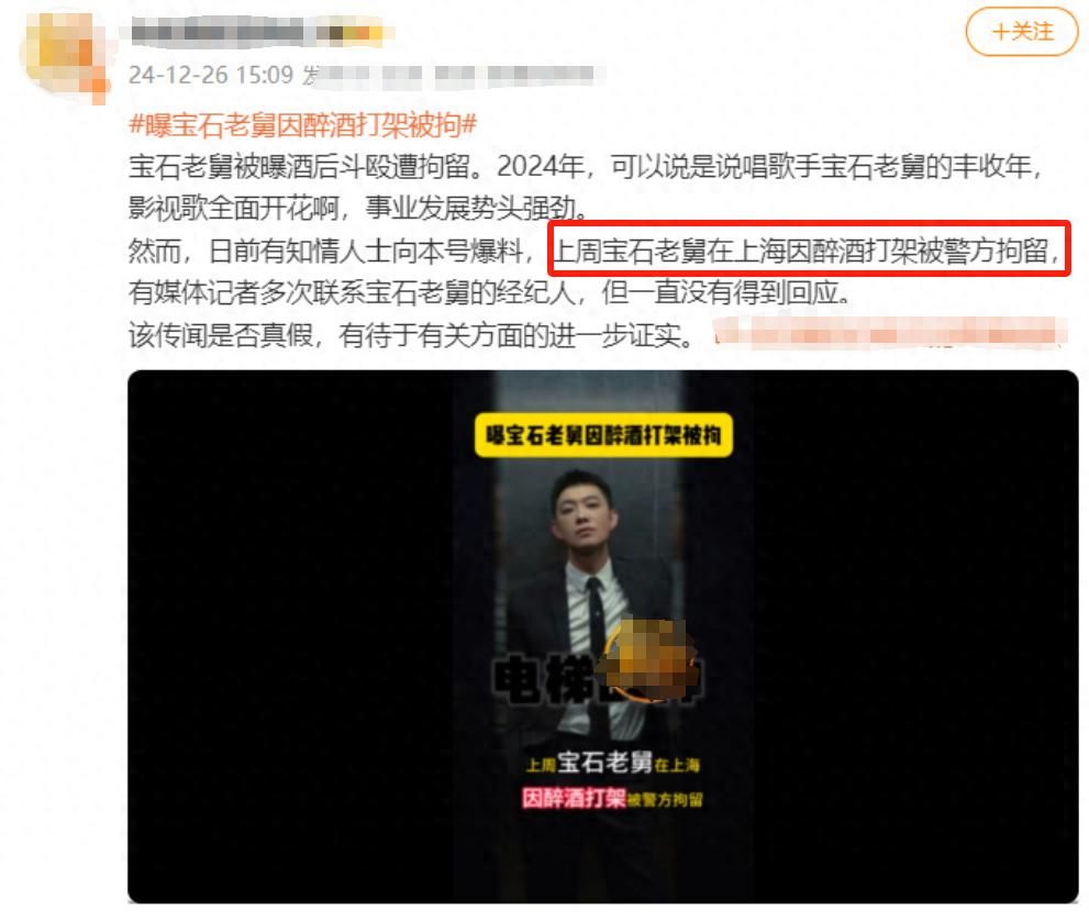 12月26日,有媒体曝光著名歌手宝石老舅前不久在上海醉酒打架被警方拘留,此事曝光后,迅速引发了大众热议,也将宝石老舅推上了舆论的焦点。