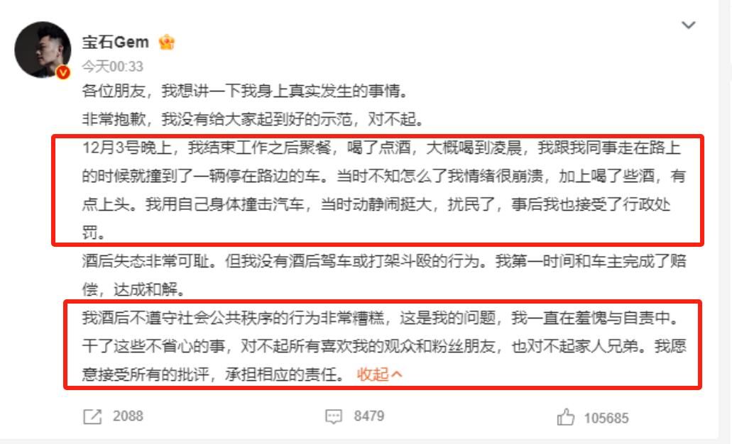 宝石老舅在发文中表示,他只是发生了酒后用身体撞车这件事情,并没有酒后驾车或者打架斗殴的行为,希望大家不要误解。