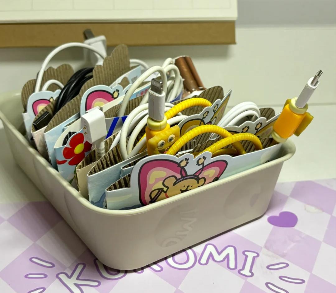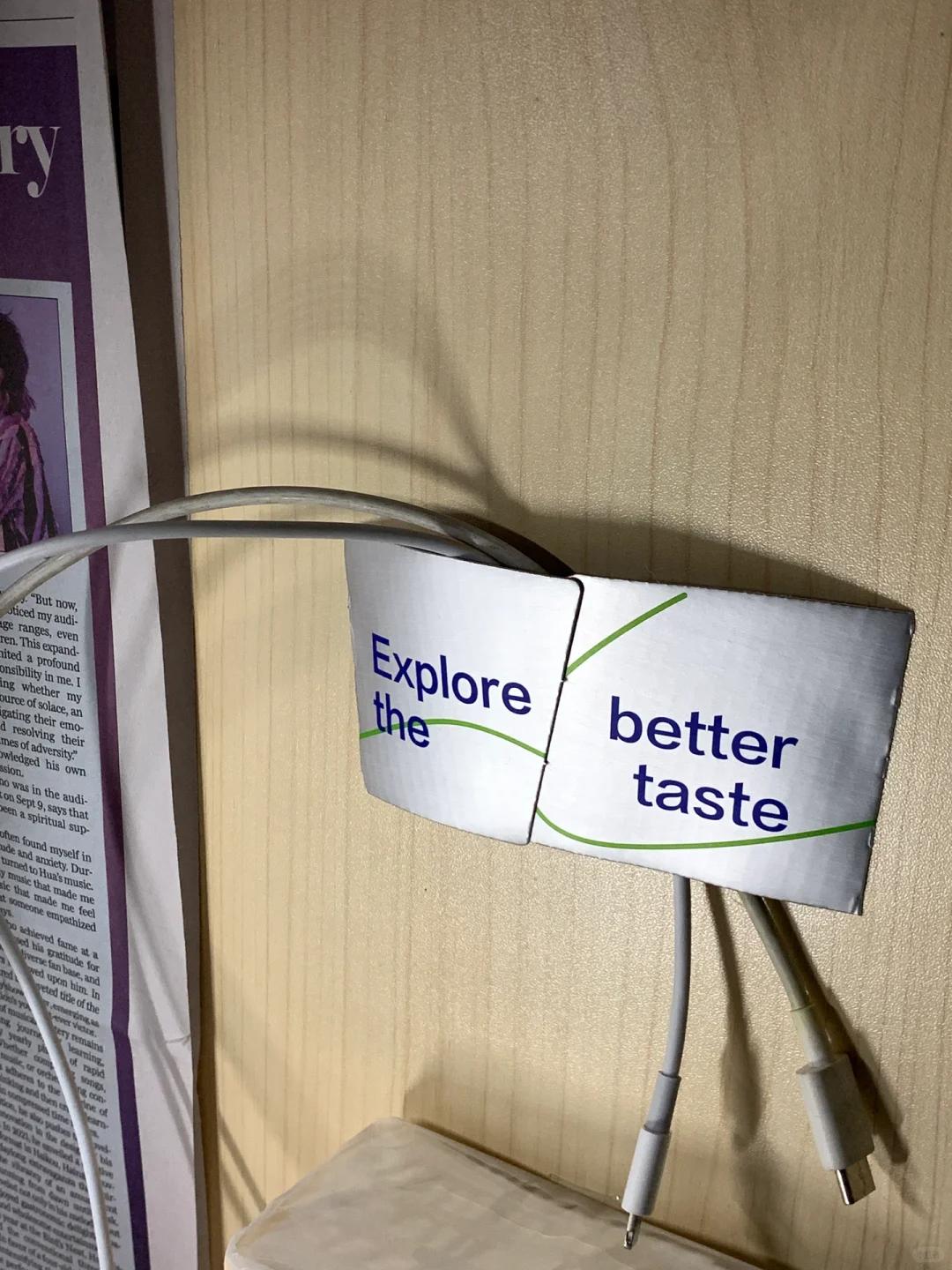 杯套对半剪开,两侧用双面胶固定粘在桌子边,保持一定的弧度,线放进去就完成啦,这下充电线不再乱了。