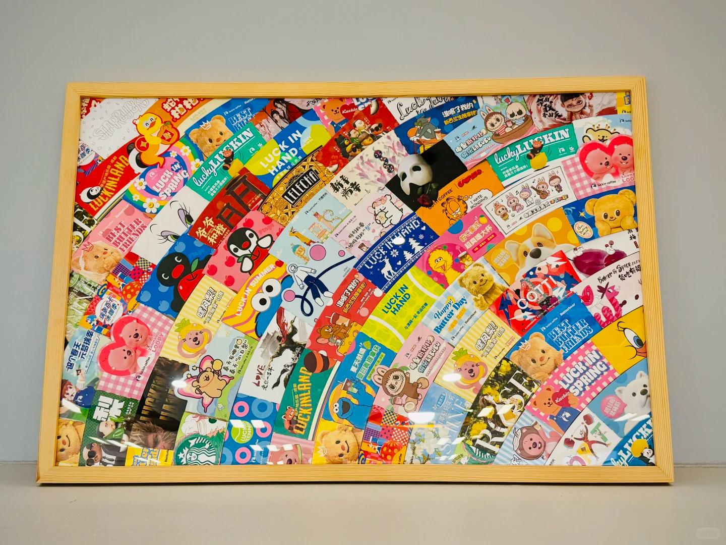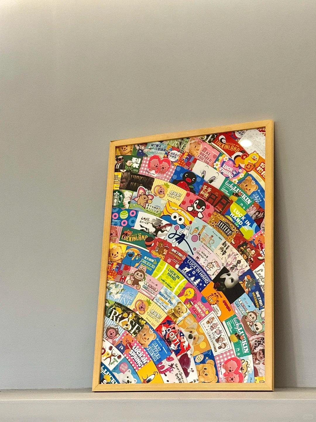 选一个适合家里大小的相框,我的尺寸是55cm*75cm,用胶水粘杯套,贴的是有弧度的设计,拼拼凑凑完成啦!