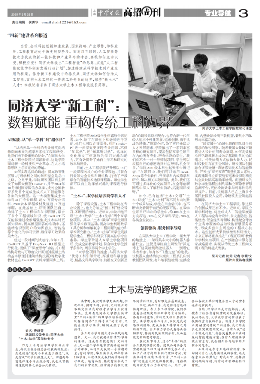 早在2018年,同济就率先设立全国首个“智能建造”本科专业,成为新工科建设的排头兵。随后,电子与信息工程学院下属电子科学与技术系(微电子学院)获批“国家示范性微电子学院”,软件学院入选“国家级特色化示范性软件学院”。
