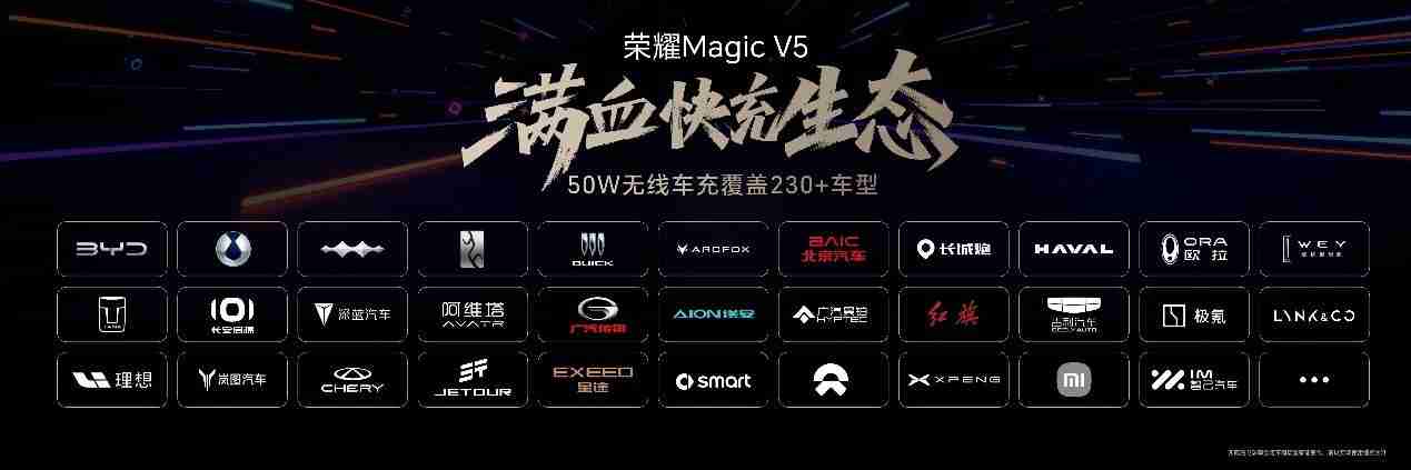 在显示方面,荣耀Magic V5满血高亮双屏,5000尼特峰值亮度,超高频调光,更清晰,更护眼;在快充生态方面,荣耀Magic V5支持66W有线快充,并支持覆盖市面上最广的230多款主流车型的50W无线快充,续航无忧。