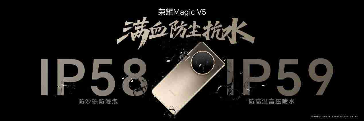 在可靠性方面,荣耀Magic V5搭载新一代金刚巨犀玻璃,防摔、防磨、防刮;满血防尘抗水,全系支持IP58和IP59。