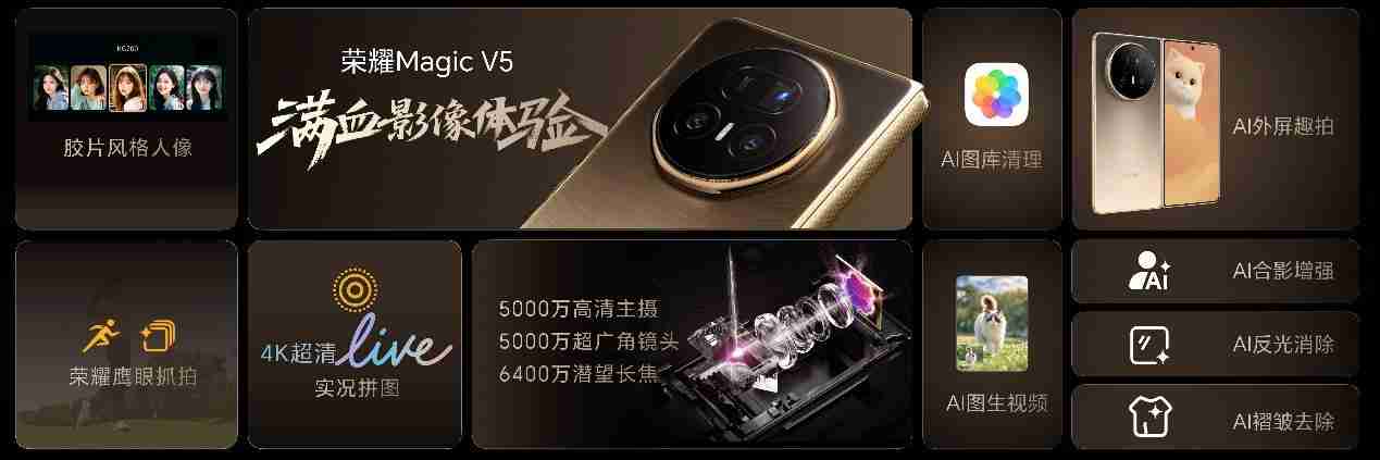 在影像方面,荣耀Magic V5配备全焦段三摄影像,1/2英寸超大传感器,6400万最高像素,f/2.5超大光圈设计,打造折叠影像标杆。同时还搭载了AI超级长焦、AI超清人像、AI胶片模拟人像、AI荣耀鹰眼超级连拍等功能,为用户提供了丰富多样的影像创作体验。