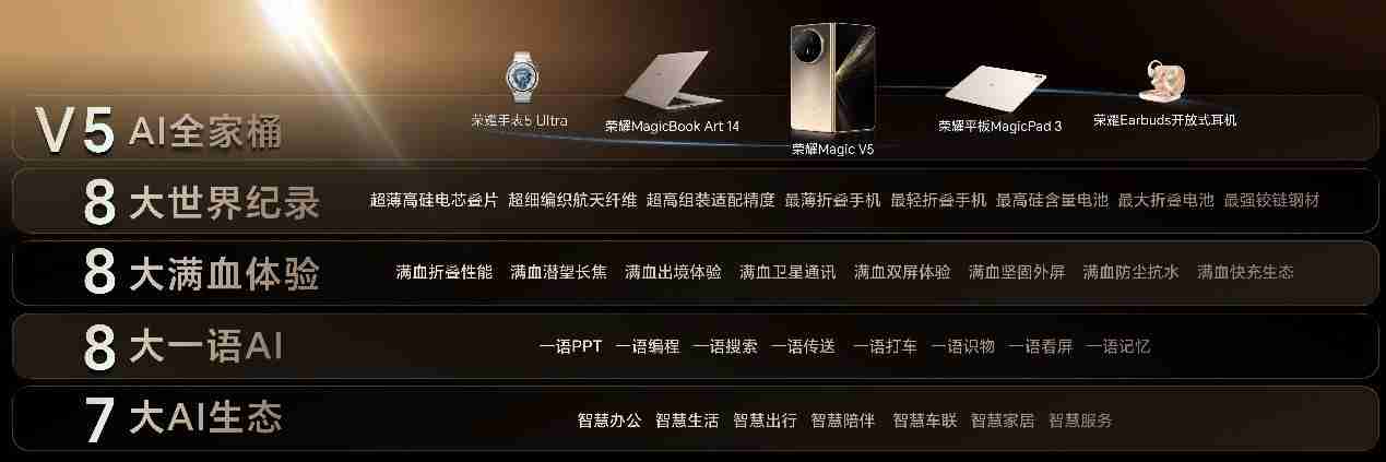 自发布第一代折叠屏产品以来,荣耀始终引领折叠屏领域进化迭代方向,持续挑战折叠屏产品极限。荣耀Magic V5厚度为8.8mm全球最薄、217g全球最轻,再次刷新行业轻薄纪录。