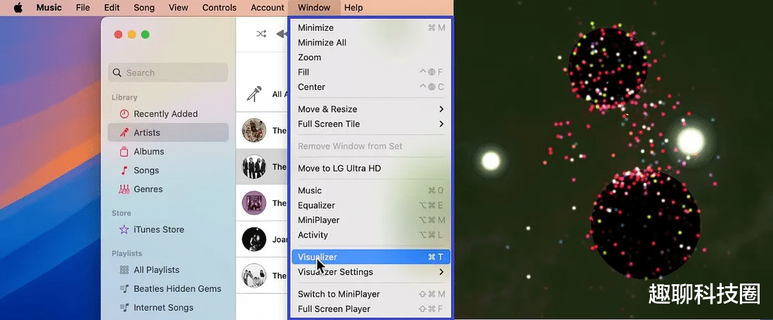 1. 音乐 App 的复古小把戏:可视化效果当年 iTunes(2001 年出现)里最迷人的玩意儿之一就是 Visualizer,音乐和画面同步跳舞,虽然现在听起来有点多余,但它还在音乐 App 的“窗口”菜单里,按下 Command + T 就能唤出来,按“?” 可以看到更多快捷键,Esc 退出,这东西现在可以被用来当背景氛围放着;