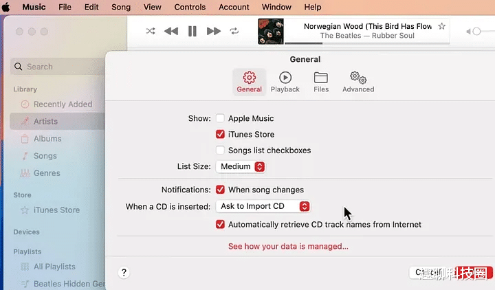 2. 一样还能刻 CD(像 2002 年那样)你没看错,Music 里还保留着刻 CD 的功能,虽然 Mac 很久没自带光驱了,但插个三十块钱的 USB 光驱就能用了,插入 CD 后,Music 会提示你导入,可以设置格式和质量,导完音乐以后用 Finder 同步到 iPhone,这种把旧光盘数字化的操作现在还可以被做,某次我把高中朋友做的混音碟导了进去,碟虽然划伤严重,但还是能读出东西;