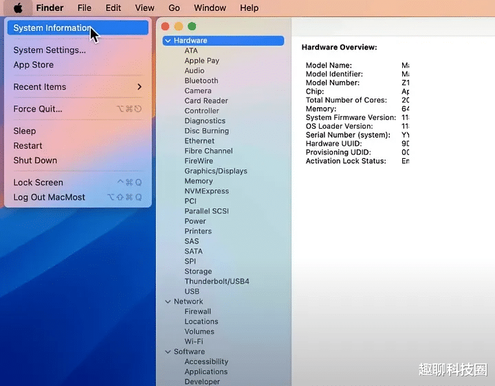 8. 系统信息:诊断的金矿原名 System Profiler 的 System Information 还在,“关于本机”里按住 Option 然后点就会进,硬件信息(内存、CPU、电池循环次数等)、软件信息(已装应用、内核扩展)、USB/Thunderbolt 设备树、GPU 和显示器细节都能查到,遇到问题或出手卖机子时,这份详细配置清单非常被需要;