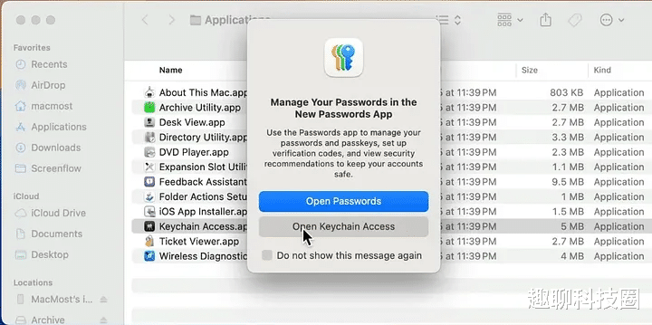 7. 钥匙串访问:密码的幕后工具很多人以为 macOS 里新版的“密码”界面把钥匙串替代了,但 Keychain Access 仍然存在,只是被藏得深一点,Spotlight 一搜就能找到,路径是在 System > Library > CoreServices > Applications,它可以查看保存的密码(如果你还在用旧界面)、查看安全笔记、管理证书,这东西对开发者和想手动检查 iCloud Keychain 内部的人来说依然很重要;