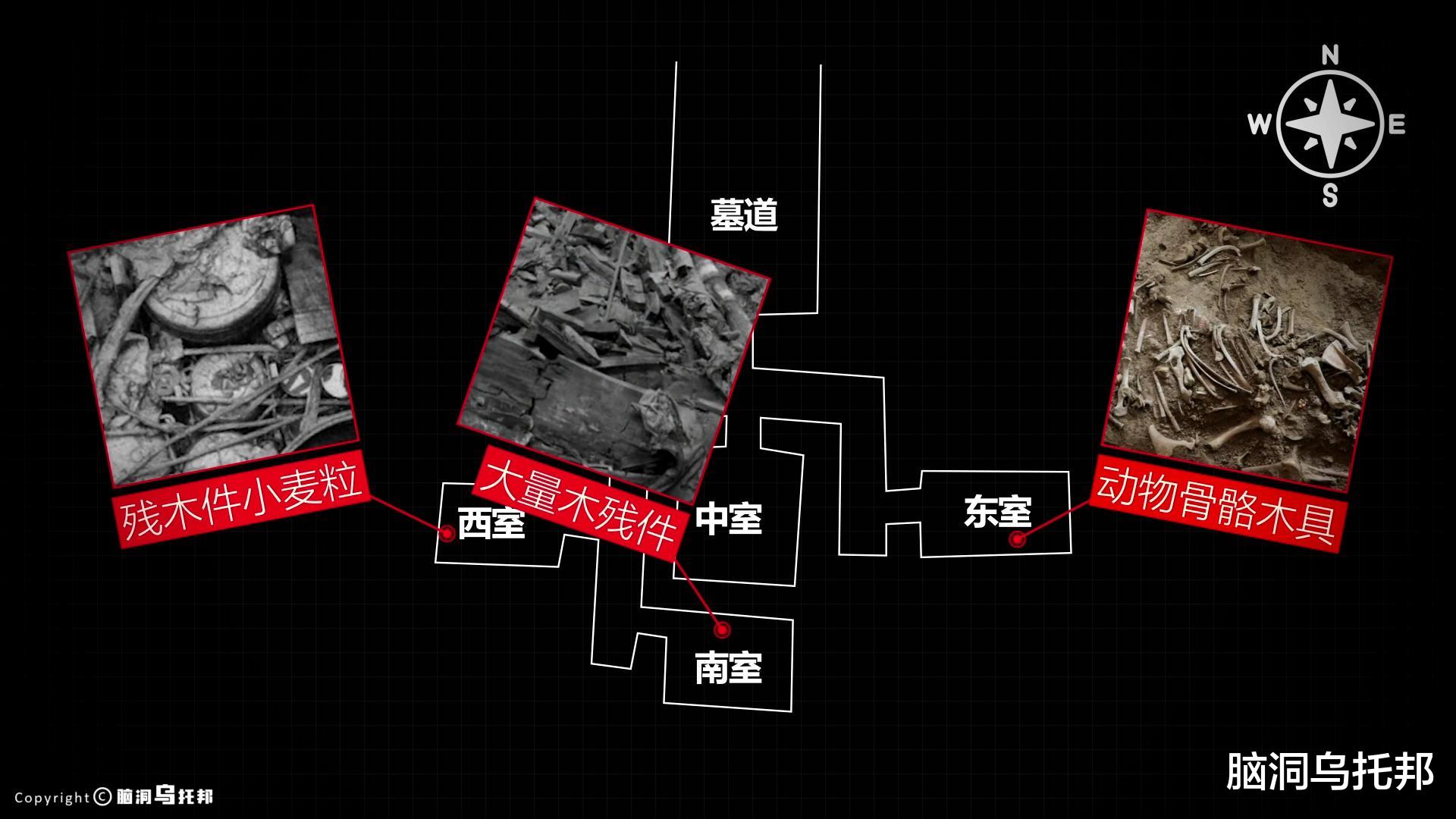 考古人员在东室内发现了大量牛、羊、马骨和木制食具,西室有一些残木件和大量小麦粒,南室里也是木残件。