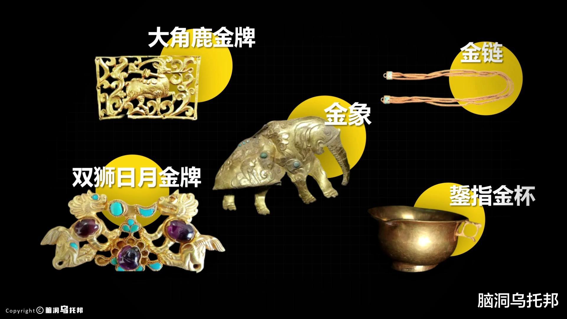 其中金器的数量是最多的,登记在册的有720件,比较著名的包括镶嵌有绿松石的金象、镶嵌绿松石的双狮日月金牌、镂空方形大角鹿金牌,用来喝青稞酒或者奶茶的鋬指金杯。