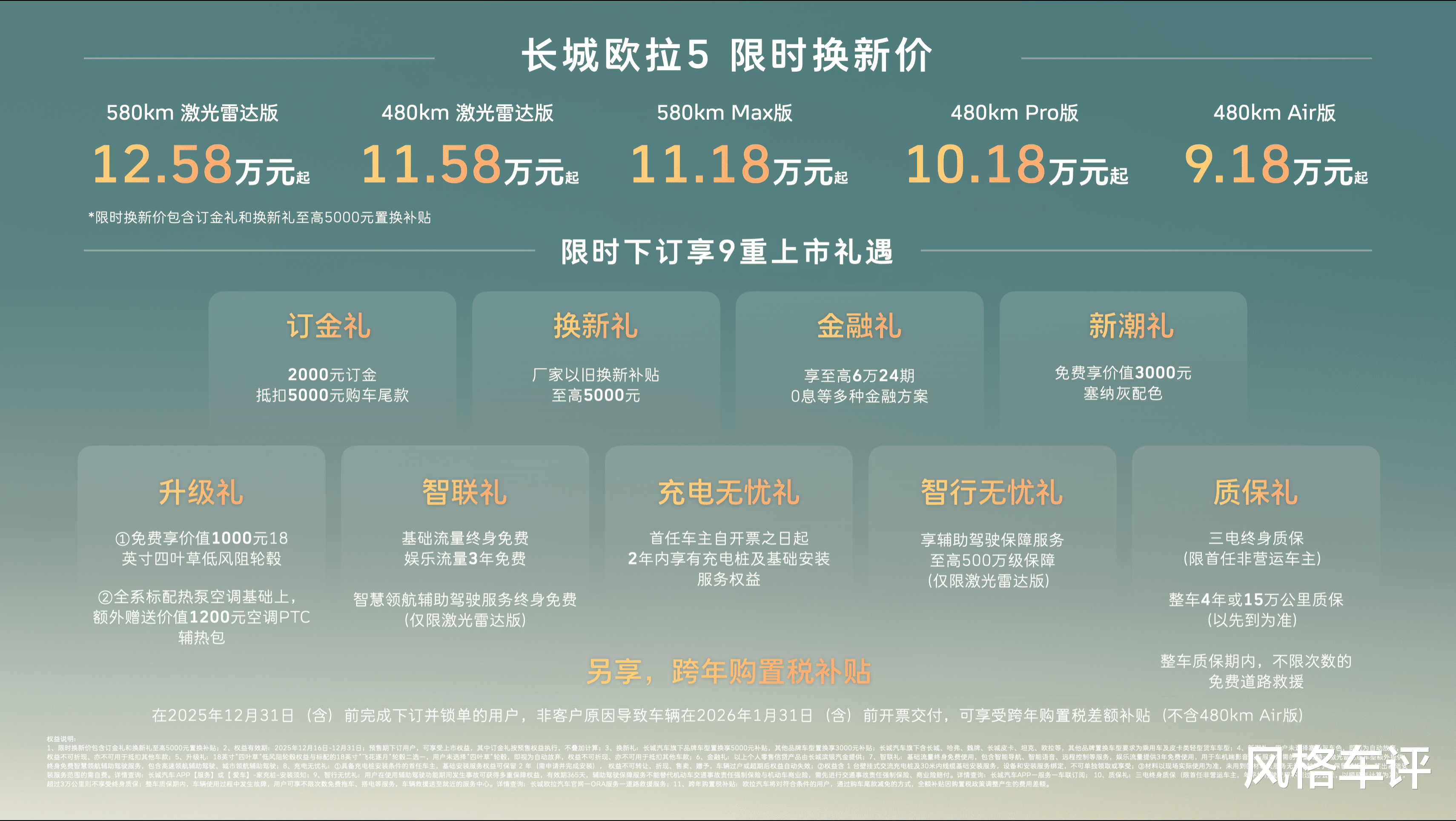 【中国·保定】2025年12月16日——今日,长城汽车欧拉品牌全新A级纯电SUV——长城欧拉5正式上市。新车共推出5款配置,建议零售价区间为 9.98万至13.38万元,限时换新价9.18万元起(限时换新价包含“订金礼”和“换新礼”至高5000元以旧换新补贴)。为回馈广大用户的热爱与支持,即日起至2025年12月31日,用户下订并锁单即可尊享包含订金礼、换新礼、智行无忧礼在内的9重上市好礼,以及跨年购置税补贴(不含480km Air版)等丰厚购车权益。凭借诚意十足的价格权益与越级产品力,长城欧拉5致力于成为全球年轻用户的“严选搭子”。