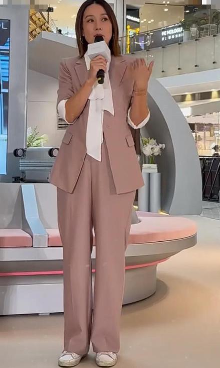 根据现场照片来看,马伊琍这次选择了一套嫩粉色的女士西装。