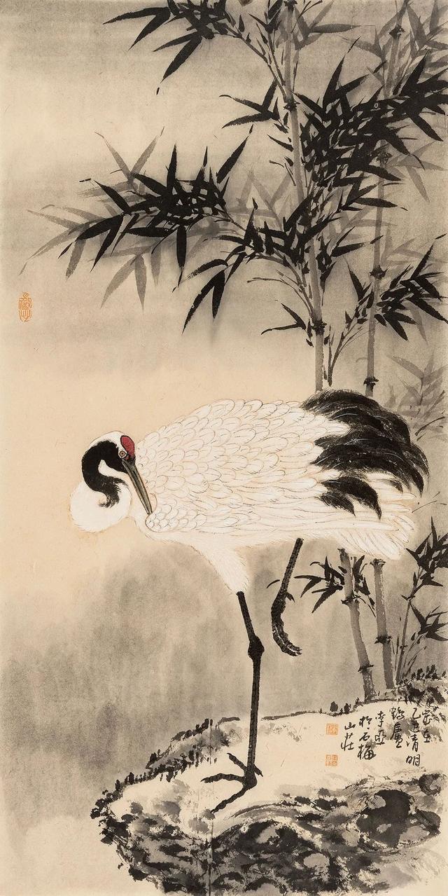天寒有鹤守梅花-纸本设色-68x34cm-2025