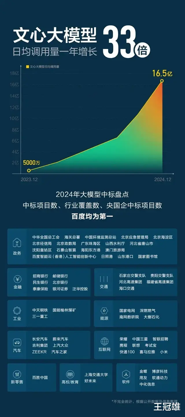 2月18日,百度发布2024年第四季度及全年财报,显示2024年总营收达1331亿元,归属百度核心的净利润达234亿元,同比增长21%。据财报,2024年12月,文心大模型日均调用量达16.5亿;四季度,智能云营收同比增长26%。