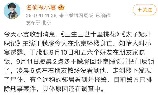 演员于朦胧坠楼的消息发酵一整天后,粉丝们也跟着揪心了一天,就连路人听到消息都难以置信,但很遗憾,奇迹没有发生,工作室对外发布讣告,证实于朦胧坠楼身故。