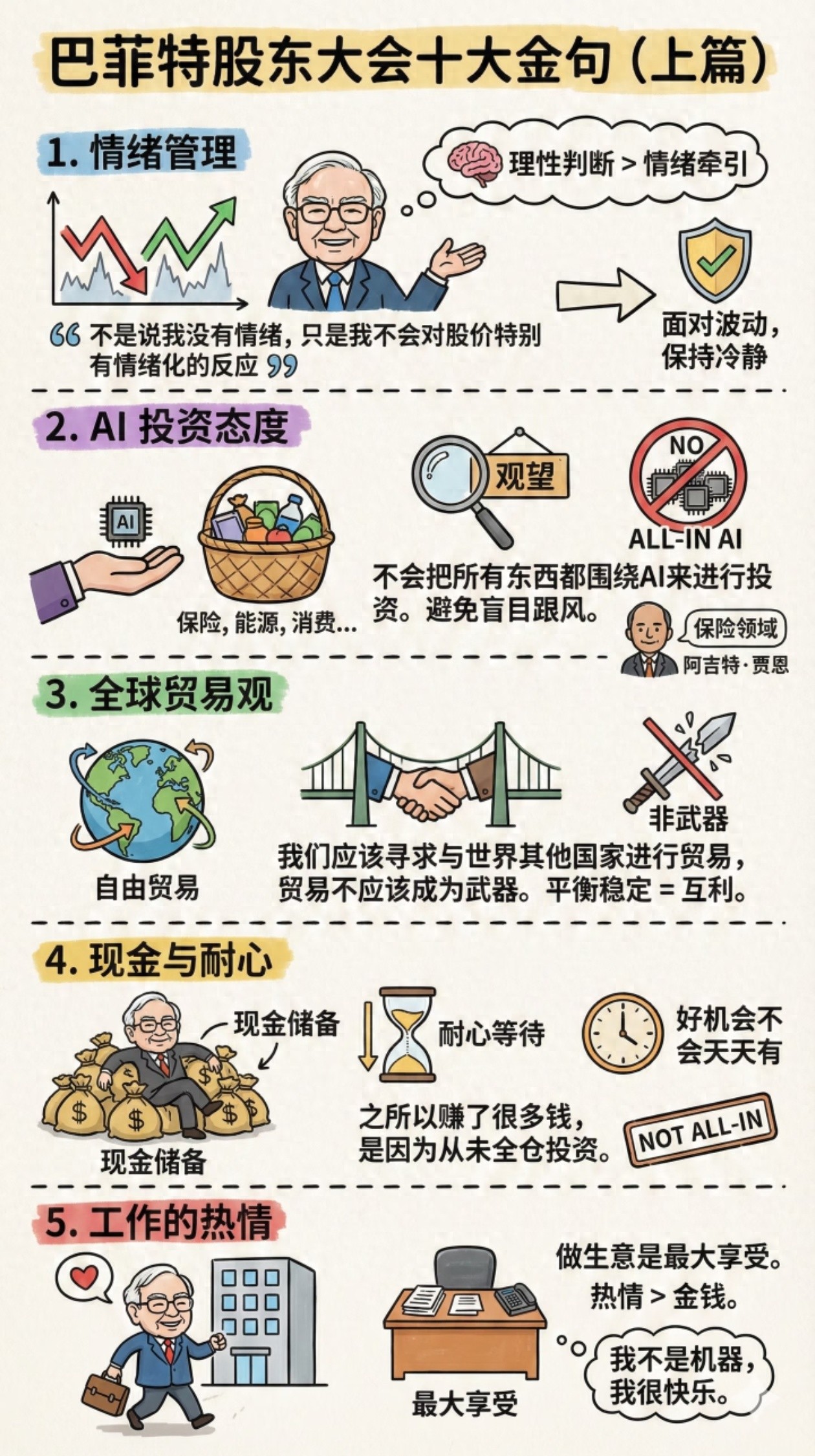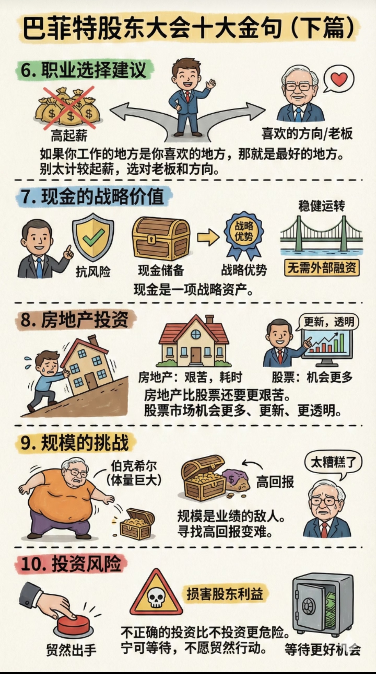 巴菲特股东大会,是全球投资者的“投资朝圣”,每一句金句都凝结了他60余年投资生涯的底层逻辑,不仅是投资指南,更是人生智慧。今天把这10大金句完整拆解,帮你吃透大师的核心思想!