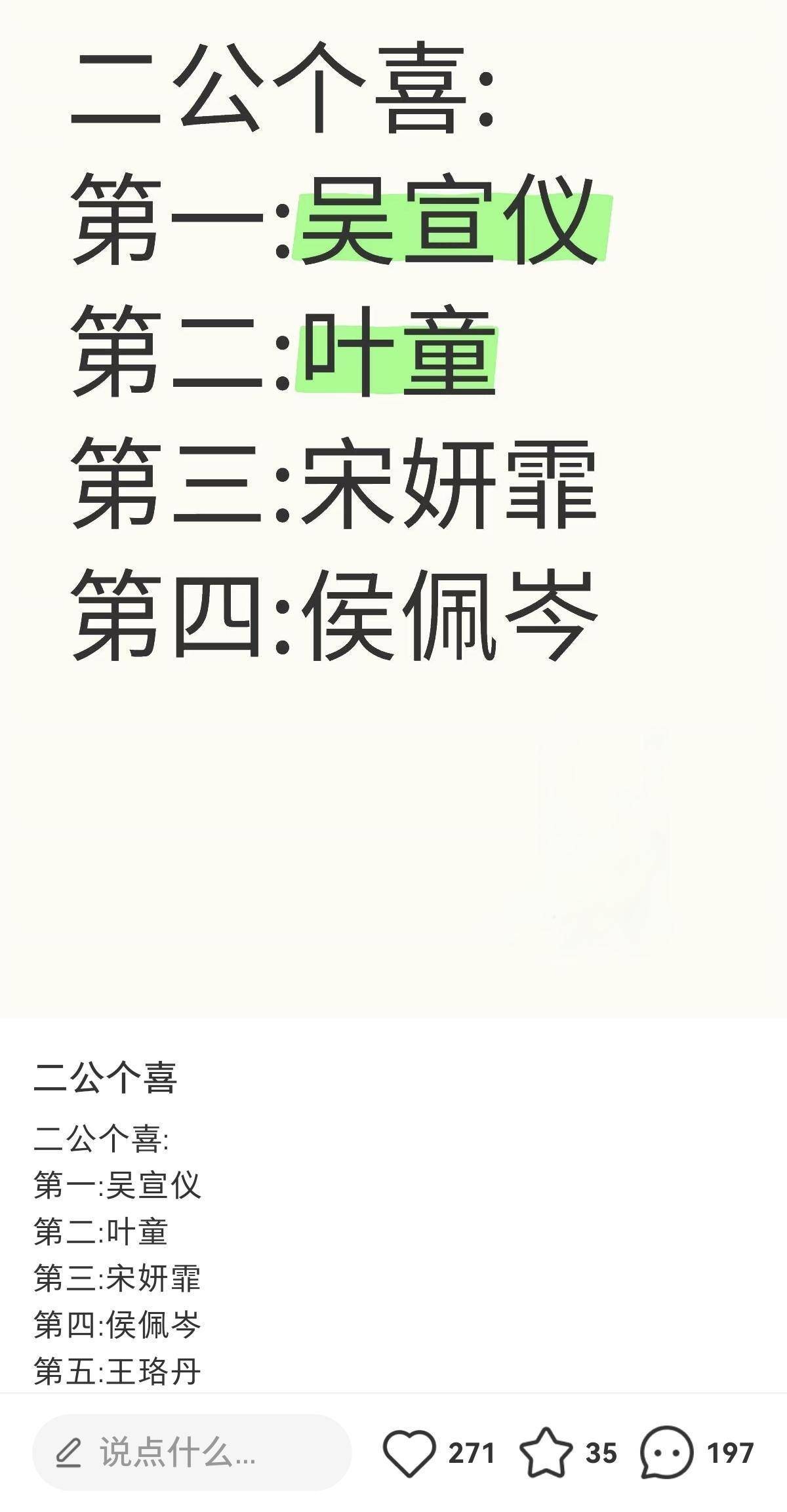 二公风云突变:“逆袭者” 登场(一)二公整体排名大洗牌在《浪姐 6》二公的舞台上,姐姐们的排名出现了巨大的变化,竞争激烈程度堪称白热化 。一公时,叶童凭借超高的国民度和精彩表现,稳居个人喜爱度第一名,成为了大家眼中的夺冠大热门。然而,二公的舞台就像一个充满变数的神秘战场,一切都有可能发生。姐姐们的排名发生了翻天覆地的变化,原本排名靠前的姐姐可能因为一次失误或者选曲的问题,名次大幅下滑;而一些在一公时表现并不突出的姐姐,却凭借着在二公舞台上的精彩逆袭,成功跻身前列。这种排名的大洗牌,让观众们看得目不暇接,也让整个节目充满了悬念和惊喜。