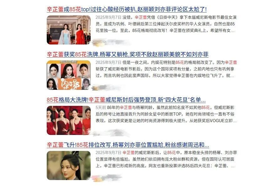 媒体之所以乐此不疲的盘点、排名,是因为这类标签极大简化了叙事成本,成为了制造话题的快捷方式。“某某能否跻身85花”,本身就是一个安全且高效的话题。它无需深究答案,只需抛出问题,就能轻松制造对立、收割流量,堪称最低成本的“选题富矿”。