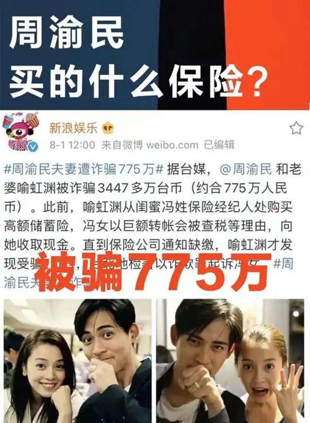还有台湾省演员周渝民与妻子喻虹渊也同样遭遇了来自“熟人”的算计,他们投保了6年期的高额储蓄险,承办的冯姓保险经纪人与喻虹渊是好友。