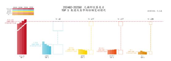 但也几乎从此时开始,三得利与农夫山泉拉开了差距。据马上赢数据,从2024Q2—2025Q1四个季度市场份额的平均值来看,三得利的市场份额只有农夫山泉的八分之一,并且农夫山泉的市场份额一直在上涨,而三得利却在逐个季度下降。