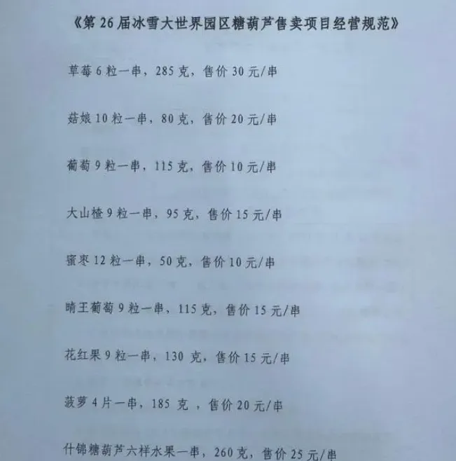 根据冰雪大世界糖葫芦摊位经营权的拍卖须知,管理运营方对糖葫芦的价格和规格都做了要求,糖葫芦的价格区间在10-30元之间,平均价格多为15元左右一串。