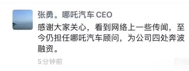 4月14日,哪吒汽车原CEO张勇发朋友圈回应“身在英国传闻”称:“感谢大家关心,看到网络上一些传闻,至今仍担任哪吒汽车顾问,为公司四处奔波融资。”