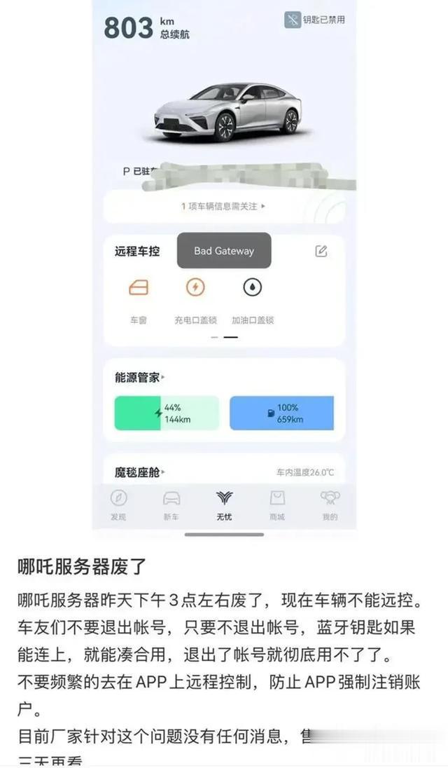 截至发稿前,哪吒汽车App出现“网络异常”,车联网数据已停止更新,车辆远程操控等功能无法使用,首页“发现”栏目显示为“暂无数据,点击重试”,如果用户尝试重新登录App时会出现“HTTP 502 Bad Gateway”错误提示。