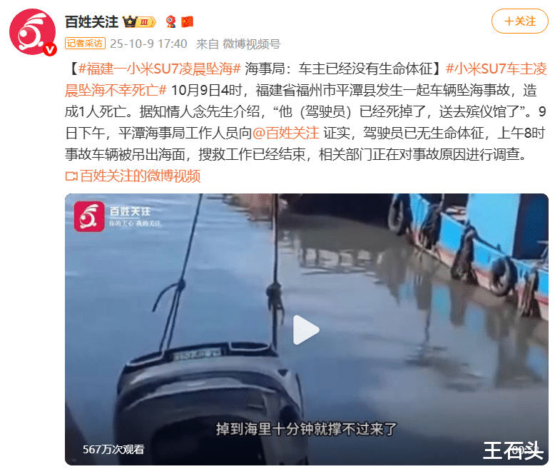 10月9日凌晨4点,福建福州平潭县的澳前镇东澳渔人码头,一辆白色小米SU7栽进了海里,平潭海事局事后证实了这场悲剧。