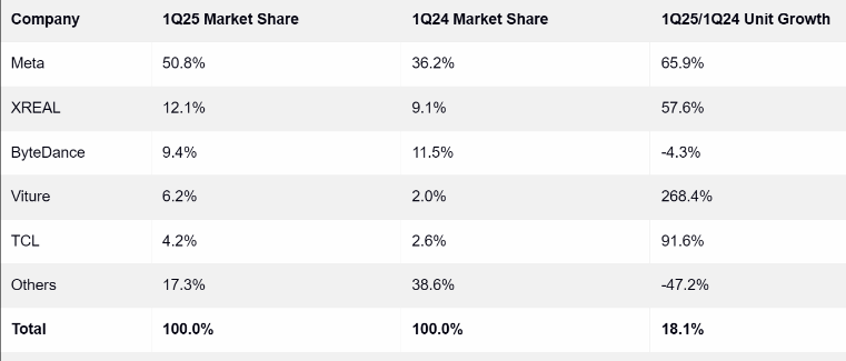 据不完全统计,2025上半年,Meta一季度出货量已达60万台,XREAL凭借One系列的强劲出货量获得了第二名的位置。Viture以惊人的268.4%的年增长率脱颖而出,而TCL也取得了令人印象深刻的91.6%的增长。