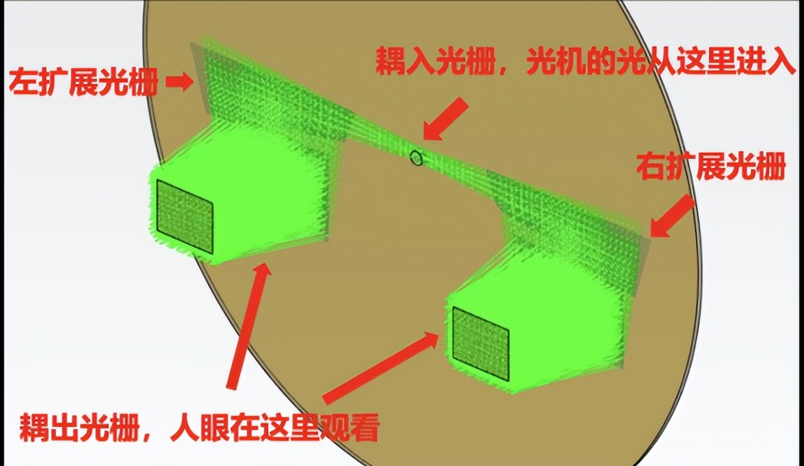 所谓一拖二,就是将原来在眼镜腿上的两个光机,缩减为在眼镜正中间的一个光机, 即单光机输入,双目输出。