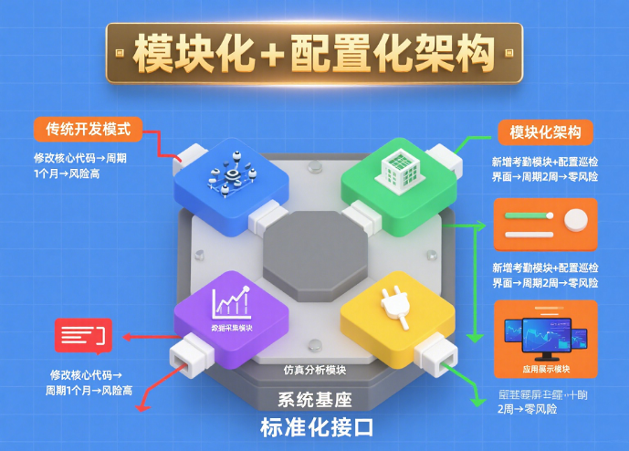 另一方面,采用 “模块化 + 配置化” 架构,实现 “需求快响应”。面对业务需求的变更,传统开发模式需修改核心代码,周期长、风险高,而模块化架构可将孪生系统拆解为 “数据采集模块、模型渲染模块、仿真分析模块、应用展示模块” 等独立单元,各模块通过标准化接口对接,需求变更时仅需调整对应模块或配置参数。某智慧园区数字孪生项目中,初期需求为 “安防监控 + 能耗统计”,交付后园区新增 “人员考勤 + 设备巡检” 需求,项目团队通过在现有系统中新增 “考勤数据对接模块”,并在应用展示模块配置巡检任务管理界面,仅用 2 周便完成需求落地,而传统开发模式需至少 1 个月,且避免了对原有系统稳定性的影响。
