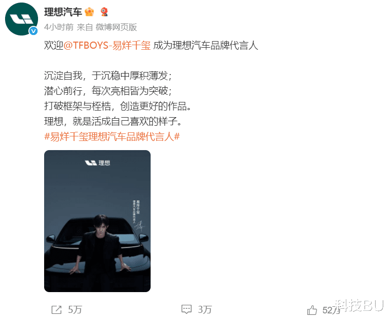 今天理想汽车宣布易烊千玺成为公司产品首位品牌代言人,公司创始人李想还透露,在今天下午3点的理想i6发布会,也将是理想汽车第一场有品牌代言人TVC的发布会。