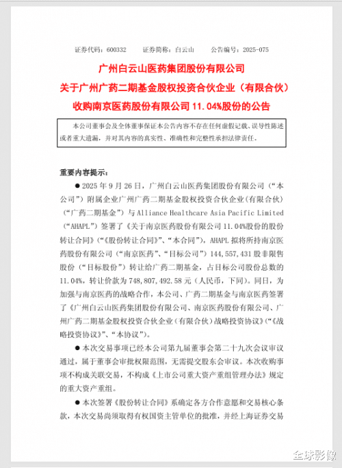9月28日,广药集团旗下上市公司广州白云山医药集团股份有限公司(以下简称「白云山」)与南京医药股份有限公司(以下简称「南京医药」)同时发布公告,白云山旗下广州广药二期基金股权投资合伙企业(有限合伙)(以下简称「广药二期基金」)拟出资748,807,492.58元人民币收购AllianceHealthcareAsiaPacificLimited(「AHAPL」)持有的南京医药股份144,557,431股非限售股份,占南京医药总股份数的11.04%。收购完成后,广药二期基金拟将成为南京医药第二大股东。