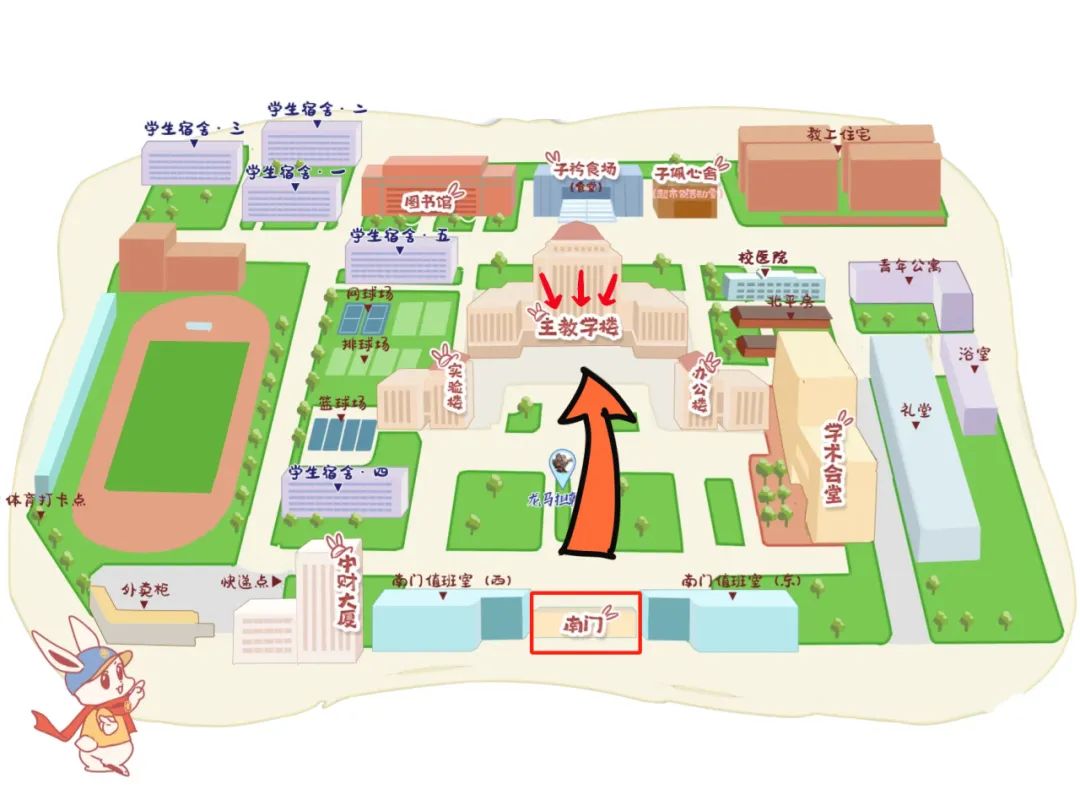 路线:南门入口,直行进入主教学楼
