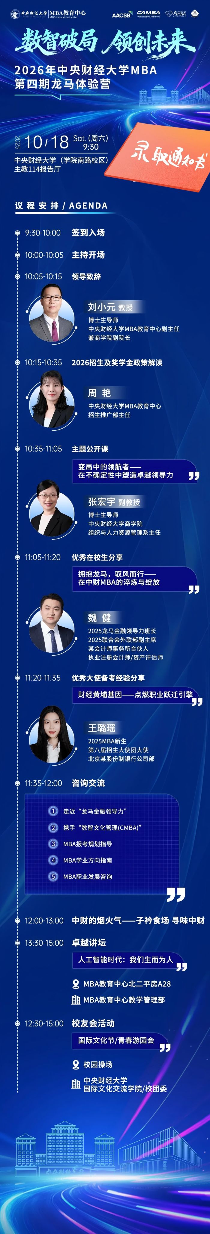 更可体验校园烟火气,参与国际文化节与青春游园会,感受中财MBA的多元生态与龙马精神!