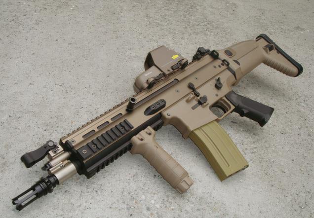 第二种FN SCAR最初是专为美军特种部队研制的特种作战突击步枪,并分为5.56毫米版本和7.62毫米版本,两个版本型号分别被称为L轻型版和H重型版。