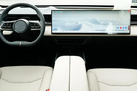 动力之外,智能配置也是大家选车时很看重的点,EZ-60 在这方面做得还算实在。坐进车里,先注意到的就是那块 26.45 英寸的 5K 一体式大屏,超窄边框,屏幕比例是 32:9,平时看视频、导航的时候,视觉上的沉浸感挺强的。但智能座舱不只是靠屏幕撑场面,它背后的芯片是联发科 MT8676 的车规级芯片,比市面上一些芯片,运算速度和响应效率都要更好一点。实际用的时候,不管是开机还是切换应用,基本感觉不到卡顿,操作起来很流畅。