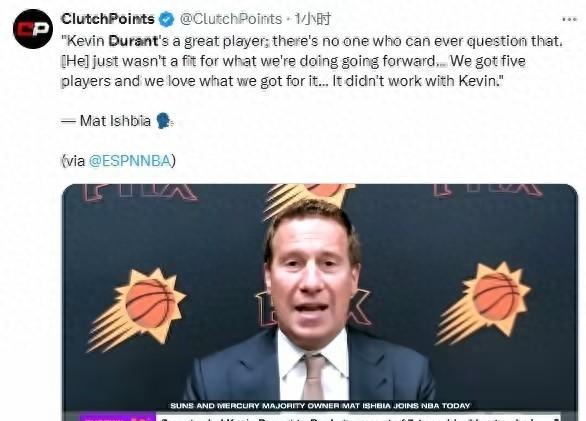 太阳老板伊什比亚解释交易杜兰特,他说道:“毫无疑问杜兰特是一位伟大的球员,他的职业生涯非常精彩,但他的加盟没有让我们发生质的变化,没有奏效。他只是不太适合我们未来的发展方向,我们换来了5名球员,对这笔操作非常满意。”
