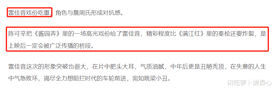 某资深影评人在评论文章中特别提及了雷佳音的表演,不仅戏份吃重,高光戏更是炸裂,甚至预测播出后会被广泛传播。