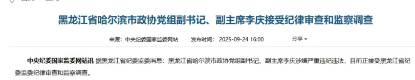 2025年9月24日,黑龙江省纪委监委发布消息:黑龙江省哈尔滨市政协党组副书记、副主席李庆涉嫌严重违纪违法,目前正接受纪律审查和监察调查。