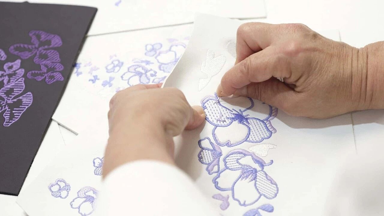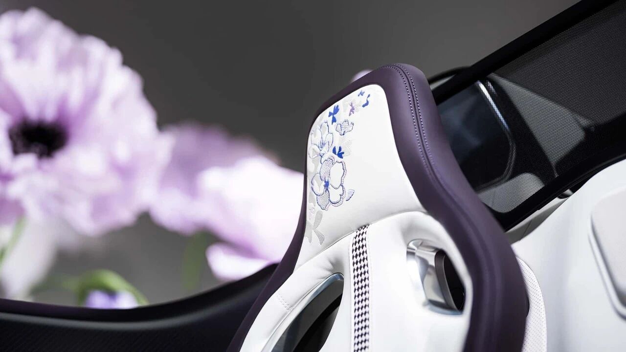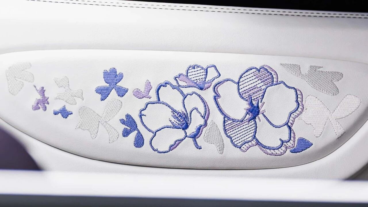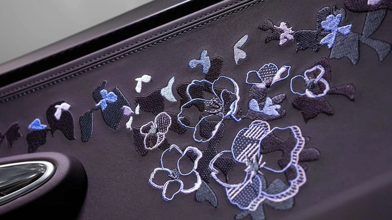花卉主题以刺绣工艺呈现,通过数万针缝线与多层工艺叠加,营造出花瓣的层次感与动态感,头枕处是对称的手工缝制花卉图案,门板上的花瓣刺绣仿佛随风轻舞,每一处细节都经过精心雕琢,无一是随意之作,完美呼应布加迪一贯的动态设计语言。