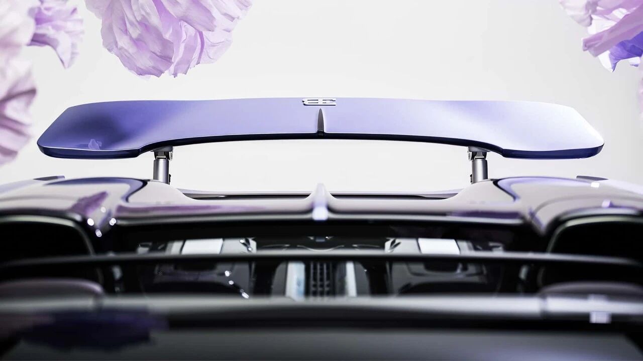可伸缩尾翼俨然成为专属艺术画布,技师通过复杂的多层遮蔽工艺,纯手工绘制出丁香花与鸢尾花的渐变图案,中心位置精心镌刻“Caroline”之名,将整车的核心情感内核直白呈现。