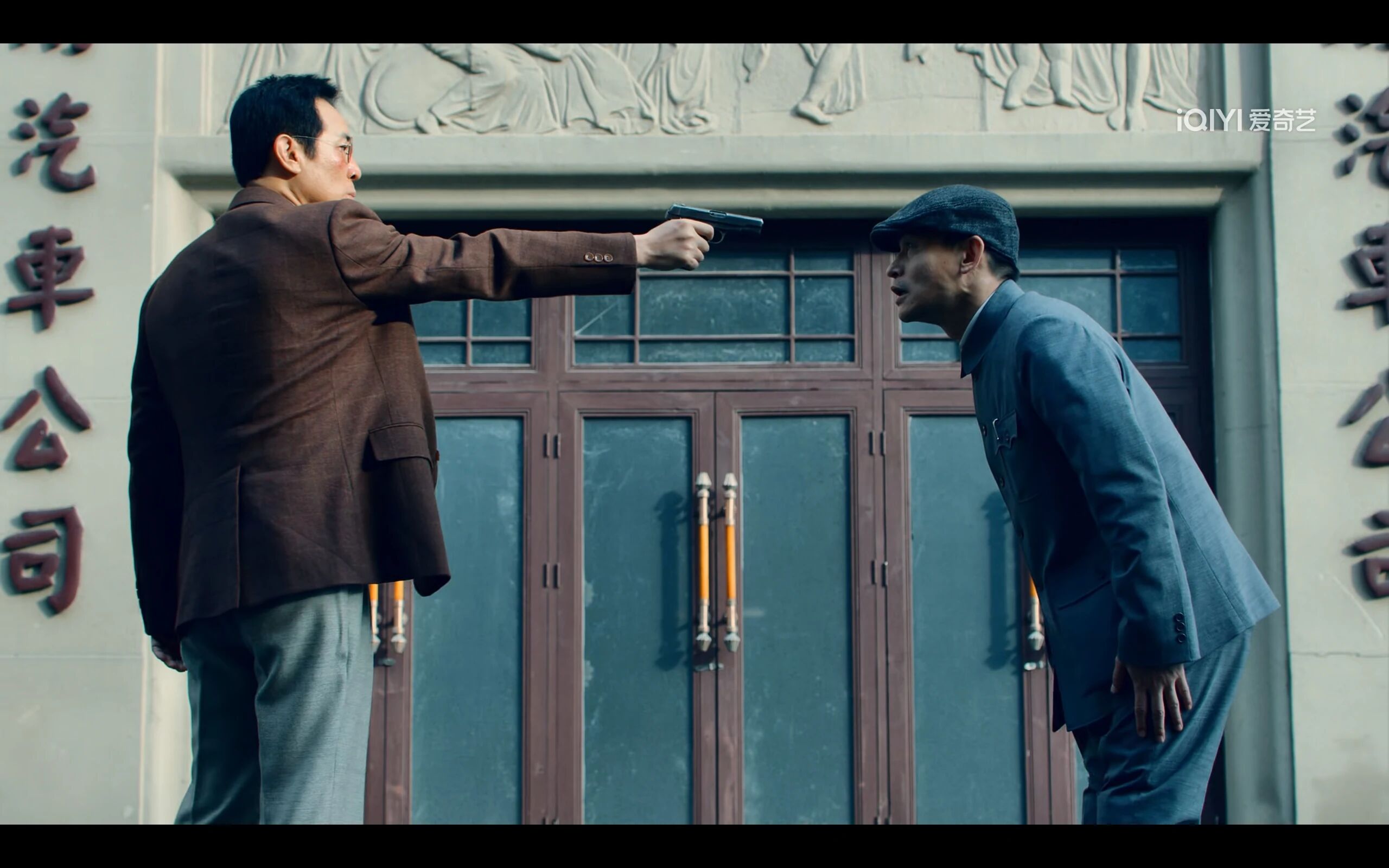 并且对着一名特务的腿,就是一枪,紧接着来到特务头子谷正文面前 ,用枪指着他的脑袋。